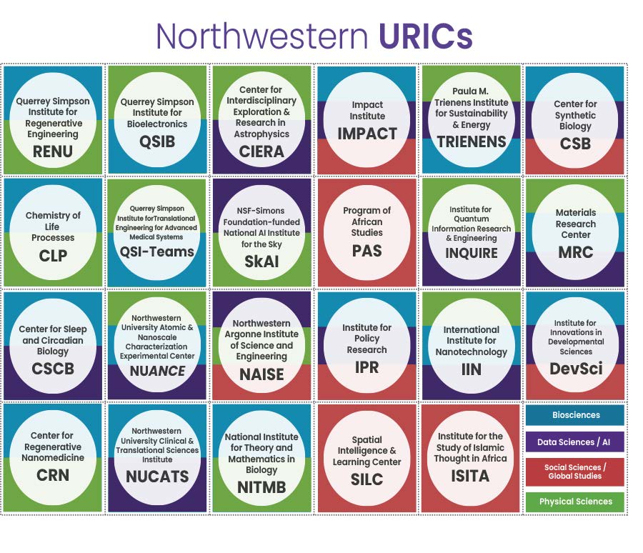 University Research Institutes and Centers (URICs) are a hallmark of Northwestern’s world-class research enterprise. Bridging disciplines across school boundaries, URICs are knowledge hubs that spur high-impact, collaborative discovery with great social benefit. Northwestern’s URICs continue to drive research innovation across domains as varied as nanotechnology; the biological sciences; energy and sustainability; policy; and more.